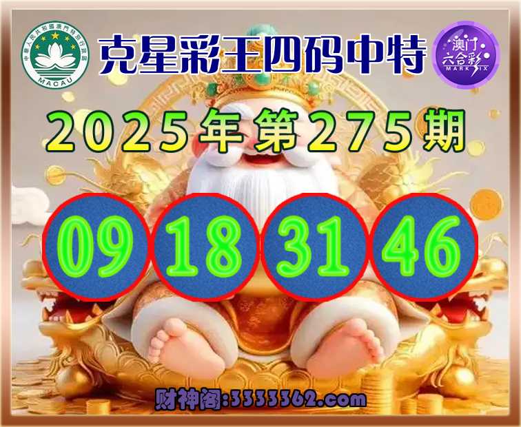 275期:【克星彩王】 🎖️ 四码中特 🎖️【09.18.31.46】开:00准
