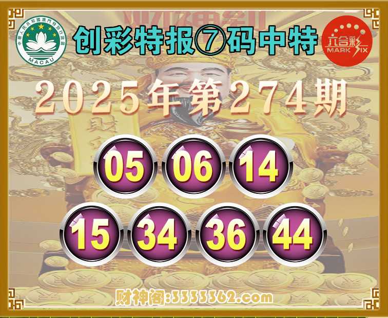 274期:【创彩特报】 🧤⑦码中特🧤【05.06.14.15.34.36.44】开:44