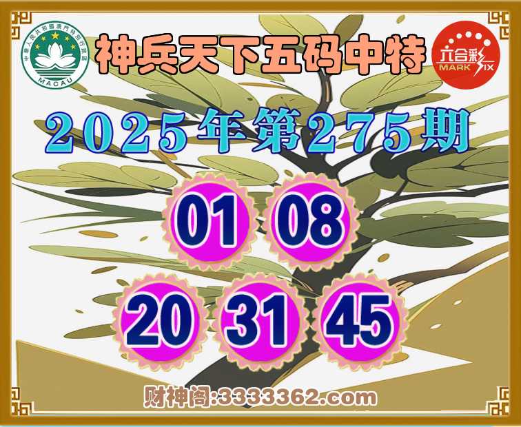 275期:『神兵天下』 😜五码中特😜【01.08.20.31.45】开:45