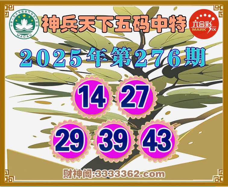 276期:『神兵天下』 😜五码中特😜【14.27.29.39.43】开:00准