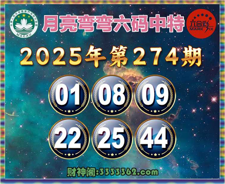 274期:【月亮弯弯】 😍六码中特😍【01.08.09.22.25.44】开:44