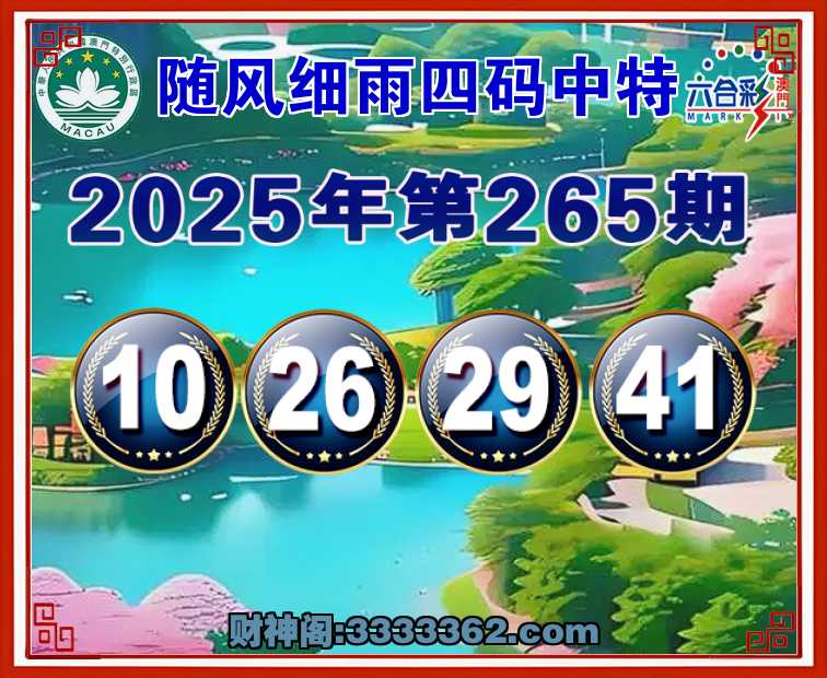 265期:【随风细雨】 🏄‍♀️四码中特🏄‍♀️【10.26.29.41】开:10