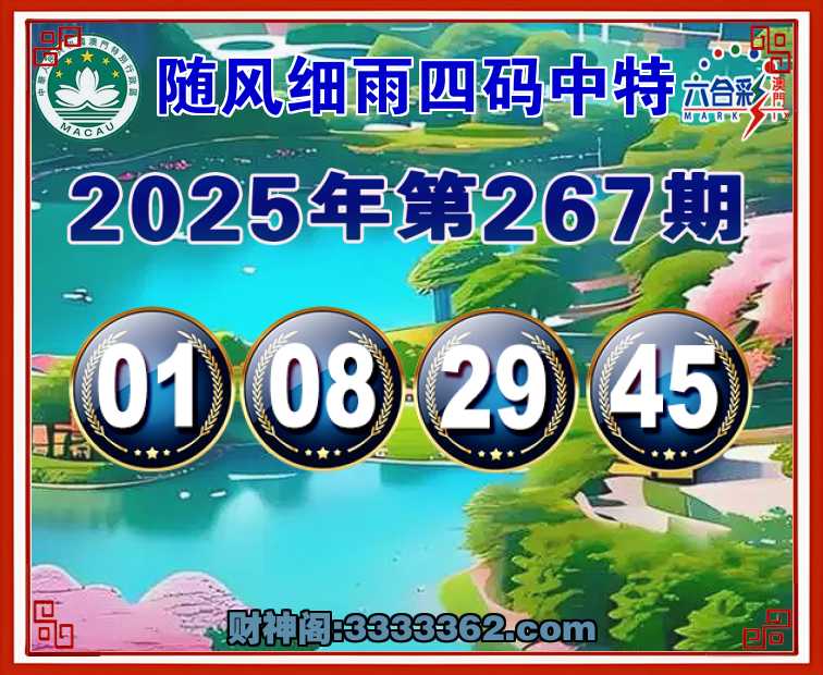 267期:【随风细雨】 🏄‍♀️四码中特🏄‍♀️【01.08.29.45】开:29