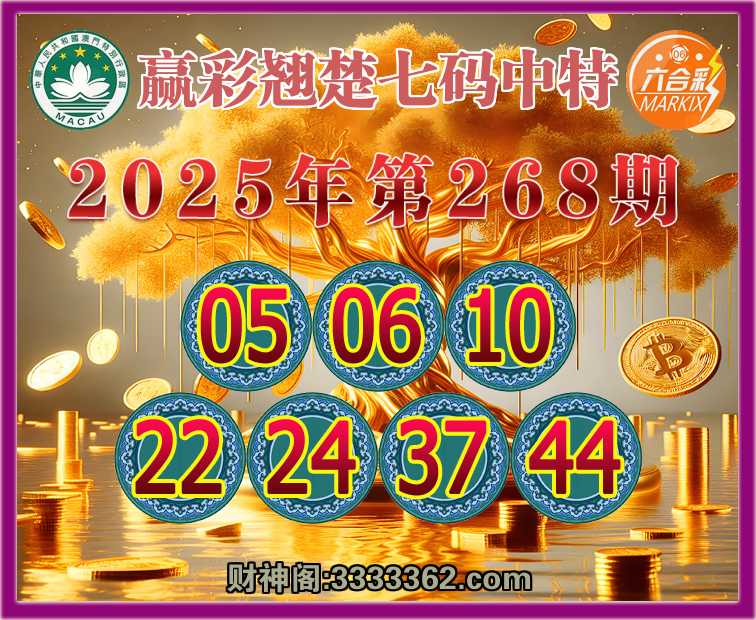 268期: 🍧『赢彩翘楚』 🍧七码中特🍧【05.06.10.22.24.37.44】开:10