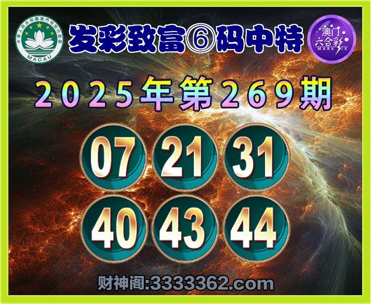 269期:【发彩致富】 🍖 ⑥码中特 🍖【07.21.31.40.43.44】开:31