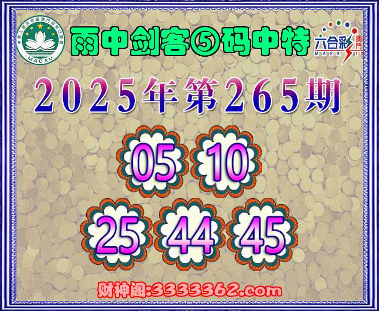 265期:〖雨中剑客〗 ♠️⑤码中特♠️【05.10.25.44.45】开:10