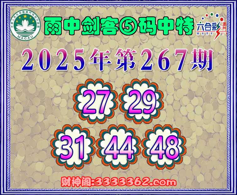 267期:〖雨中剑客〗 ♠️⑤码中特♠️【27.29.31.44.48】开:29