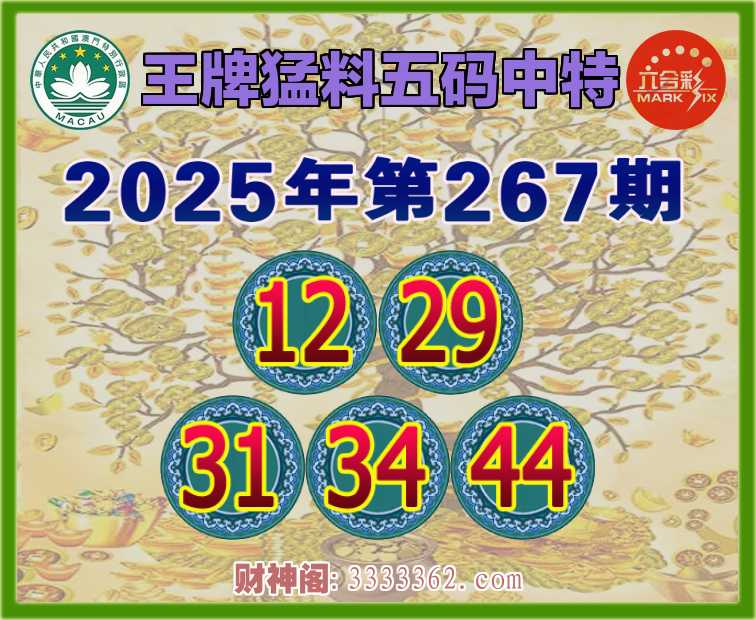 267期:《王牌猛料》 💎五码中特💎【12.29.31.34.44】开:29