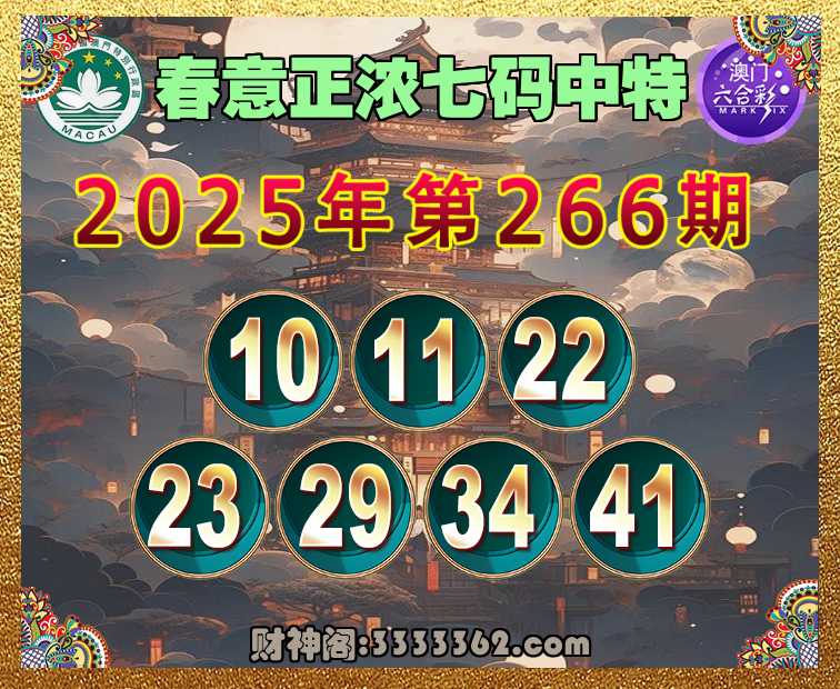 266期:【春意正浓】 🏃‍♀️七码中特🏃‍♀️【10.11.22.23.29.34.41】开:41