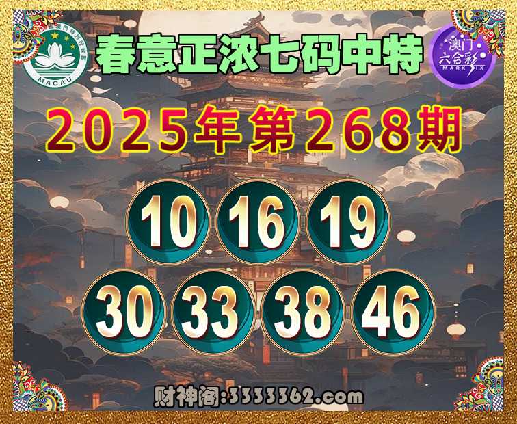 268期:【春意正浓】 🏃‍♀️七码中特🏃‍♀️【10.16.19.30.33.38.46】开:10