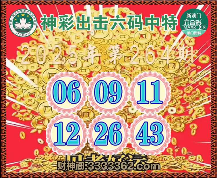 264期:【神彩出击】六码中特⌚【06.09.11.12.26.43】开:43