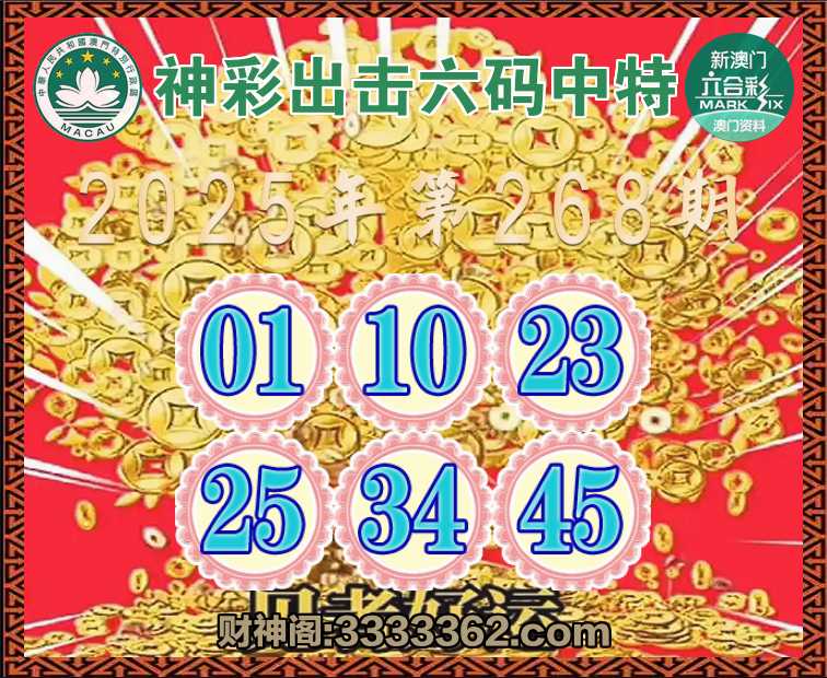 268期:【神彩出击】六码中特⌚【01.10.23.25.34.45】开:10