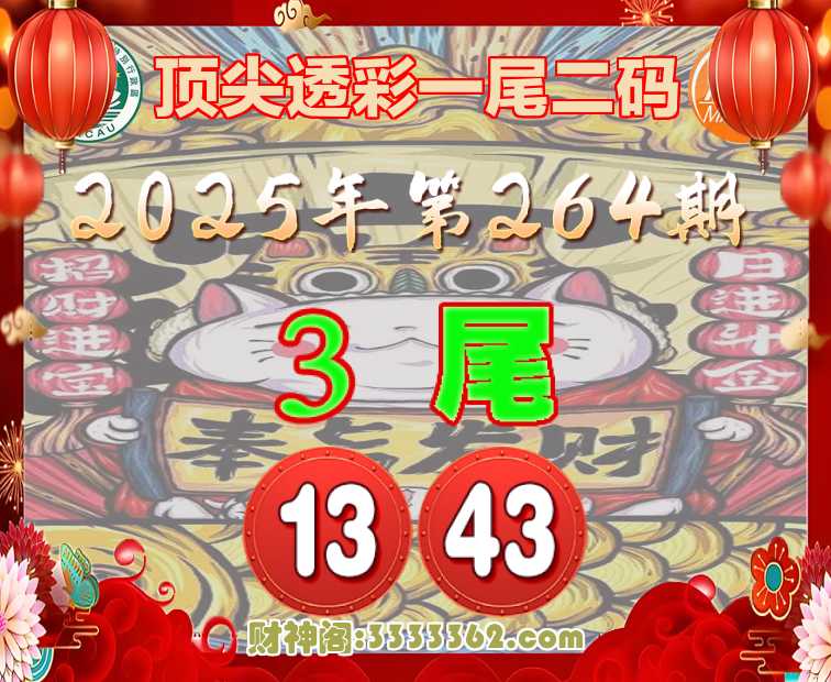 264期:《顶尖透彩》 🥓一尾二码🥓【3尾主:13.43】开:43
