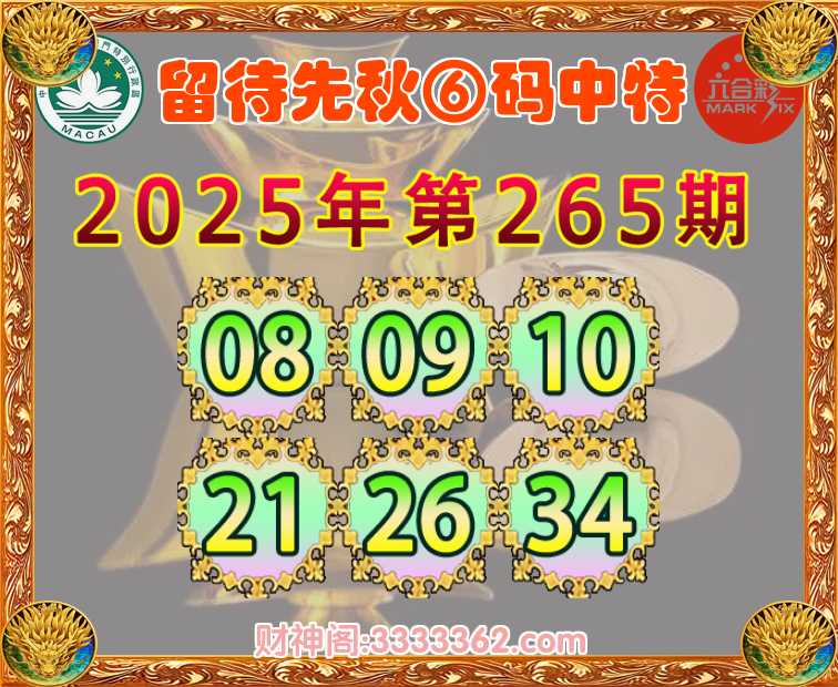 265期:【留待先秋】 🎯⑥码中特🎯【08.09.10.21.26.34】开:10