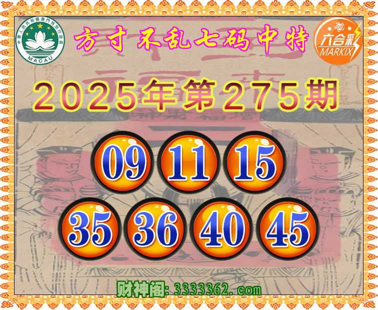 275期:【方寸不乱】 🍅七码中特🍅【09.11.15.35.36.40.45】开:45